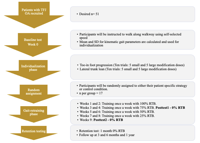 This study involves experimental research being done to evaluate and identify the most effective gait modification strategy for reducing estimated knee joint loads in patients with medial compartment osteoarthritis. An additional goal of this research is to measure the retention of kinematic changes that have occurred as a result of gait modification over time. Participants visit the laboratory for a total of 16 sessions. Participants visit the laboratory on a periodic schedule, which includes 2 baseline measurement sessions, 8 weeks of gait retraining, 2 testing sessions during the 10 weeks of the intervention, and 4 retention tests (1, 3, 6 months, and 1 year).